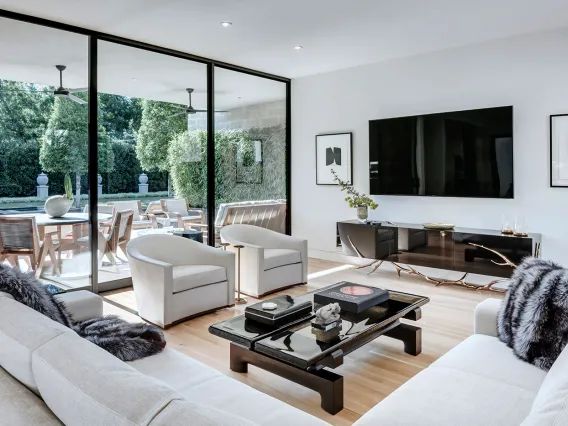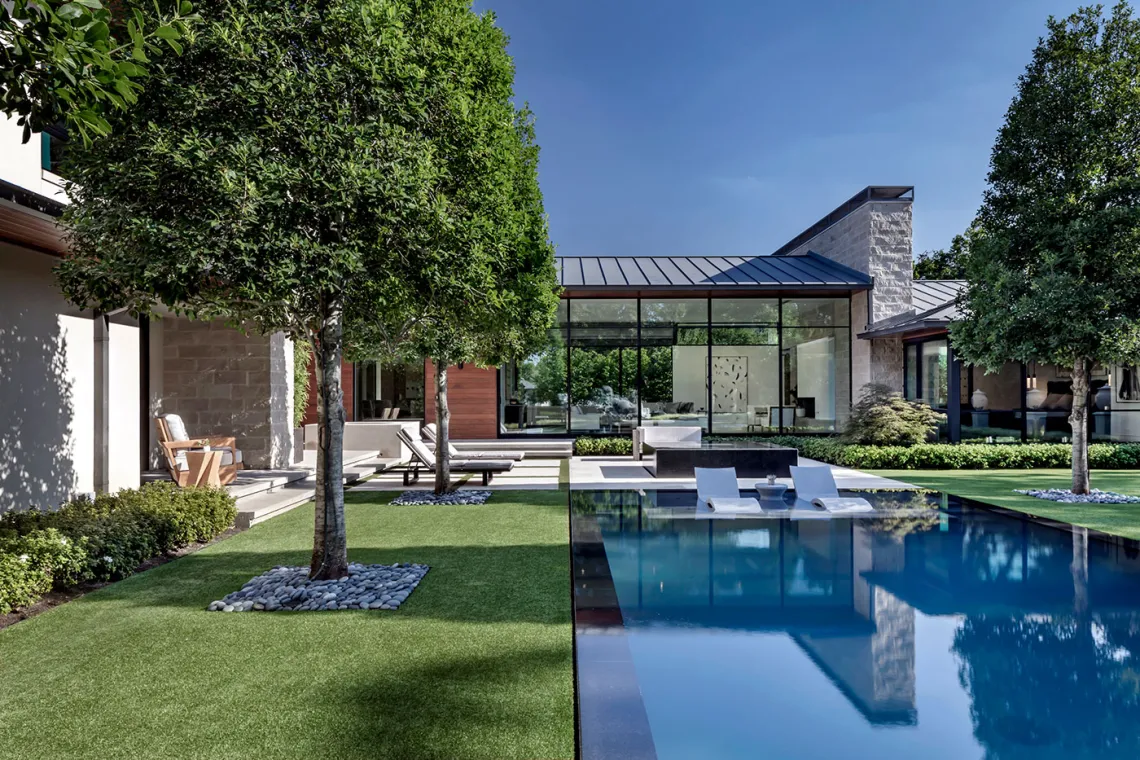 In this custom residence by Bernbaum/Magadini Architects, spacious glass walls open wide to welcome essential elements, artfully flowing through a seamless space that captures the tranquility of life through an innovative melding of brilliant blue skies, natural light, flowing water and lush greenery. Bathed in natural light, surroundings are warm and contemporary. Glass walls are open, providing nature a centerstage platform through streams of sunlight, and exquisite views of greenery and blue skies. Texas limestone in the perfect complement to rich wood floors throughout the home.