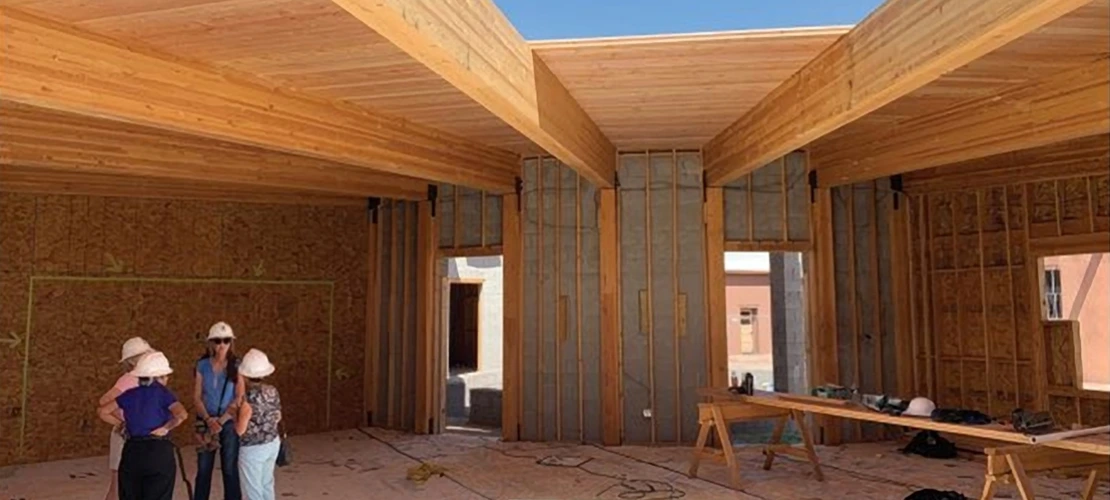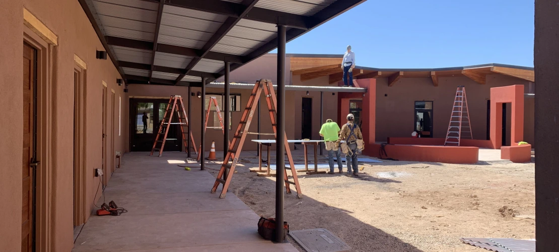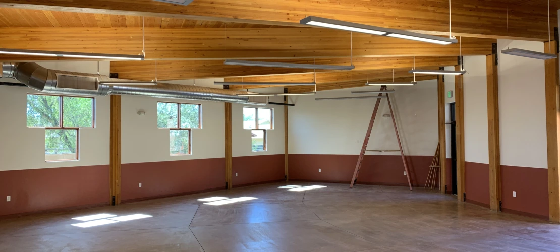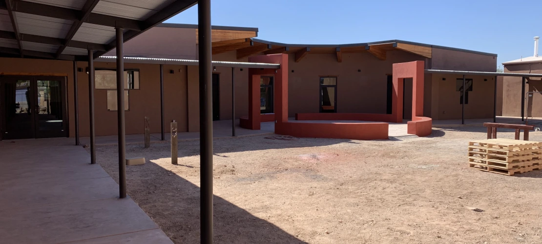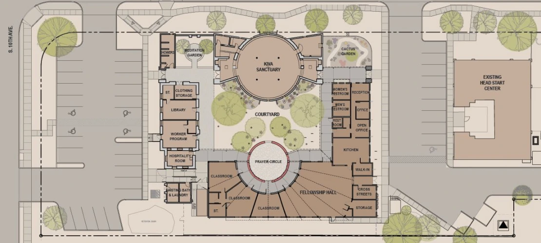 In recognition of Southside’s Native American roots, the new spaces are arranged around a central Prayer Circle with a continuous banco (seat wall) for outdoor prayer services and Arizona flagstone paving. The Prayer Circle aligns with the center of the Kiva, and the new buildings are understated so they do not outshine the Kiva. The new building is spanned with 48-foot long laminated wood beams to avoid cutting old-growth timber. The irregular shape of the new Fellowship Hall works well acoustically, as none of its surfaces are parallel to one other. Old and new structures are connected with covered outdoor walkways surrounding a central courtyard, uniting the campus.