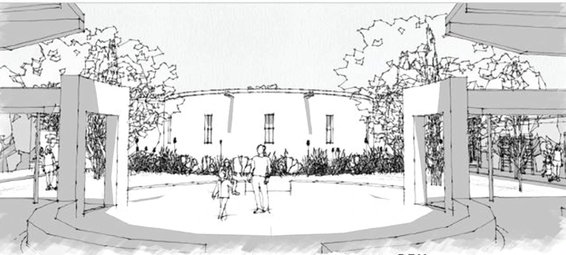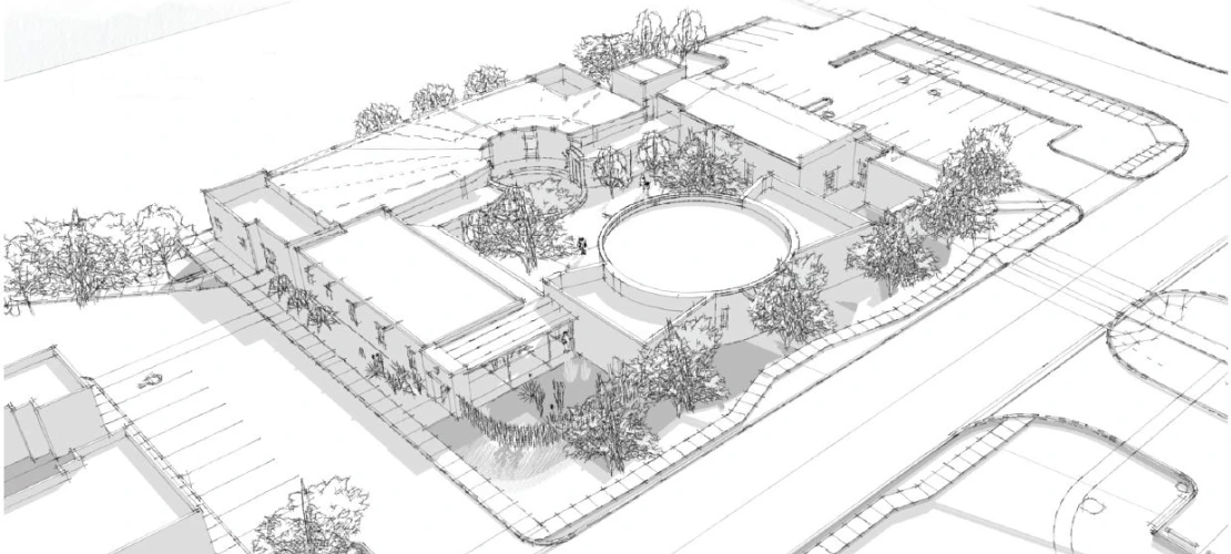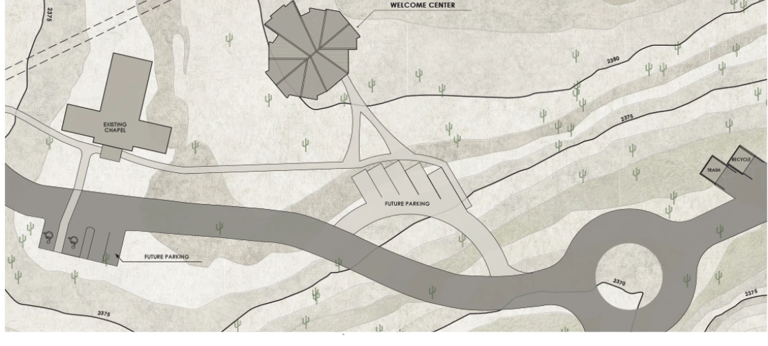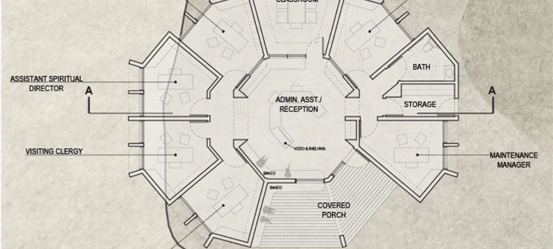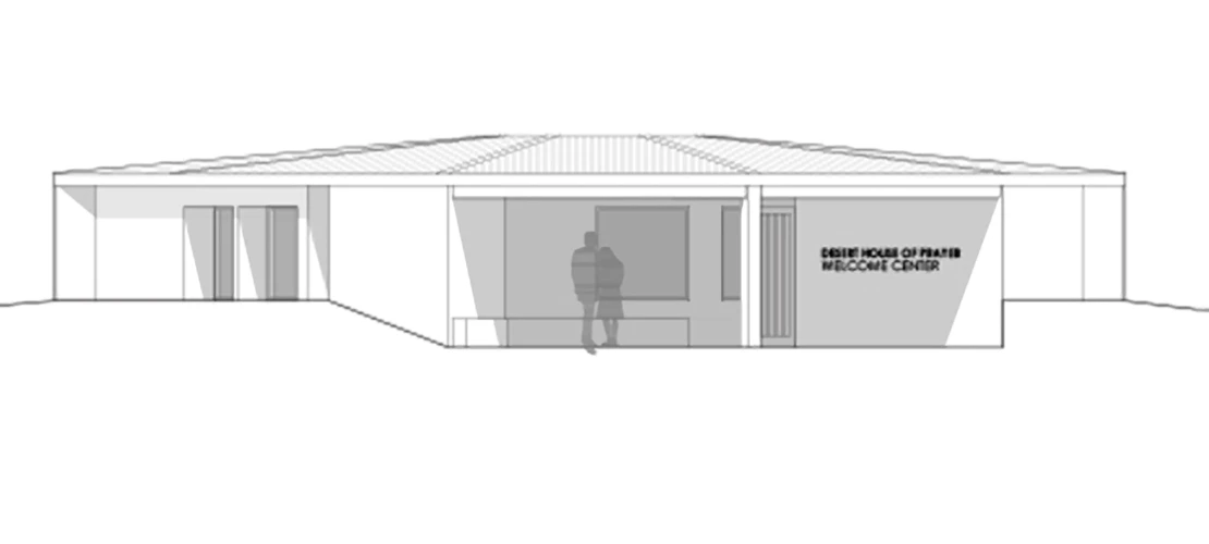 In concert with the resident Spiritual Director, Fr. Thomas Picton, Vint & Associates developed a Master Plan looking ahead for the next 40 years of the Desert House of Prayer. They identified an immediate need for an orientation space, where arriving visitors could both register and receive information about their stay. By locating this new facility at the entrance to the campus we remove the “business” aspect of the organization from the contemplative space, and create a Welcome Center, with a reception area where arriving guests will be briefed on the details of the daily routine and ritual of silence of the Desert House. Offices for the religious leadership of the community, as well as the Guest Coordinator and Maintenance Director, are located around a central shared conference/classroom space.